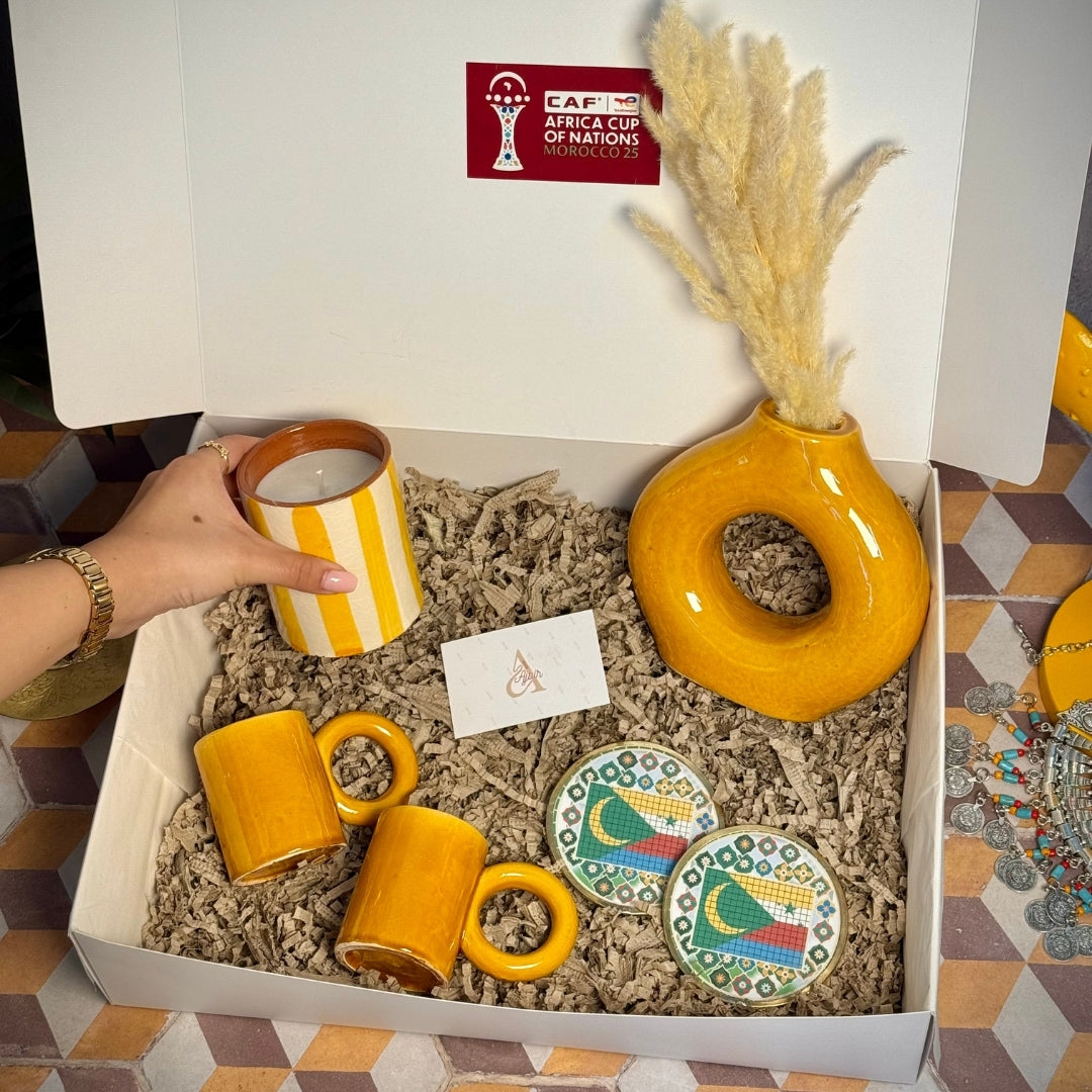 Célébrez la CAN 2025 avec un hommage raffiné à la beauté des Comores et à l'artisanat marocain. Le coffret Harmonie Solaire & Artisanat évoque la douceur des îles et la chaleur méditerranéenne, dans une composition élégante et authentique. Idéal pour les entreprises, agences événementielles ou particuliers désireux d’offrir un cadeau hautement symbolique, esthétique et artisanal.