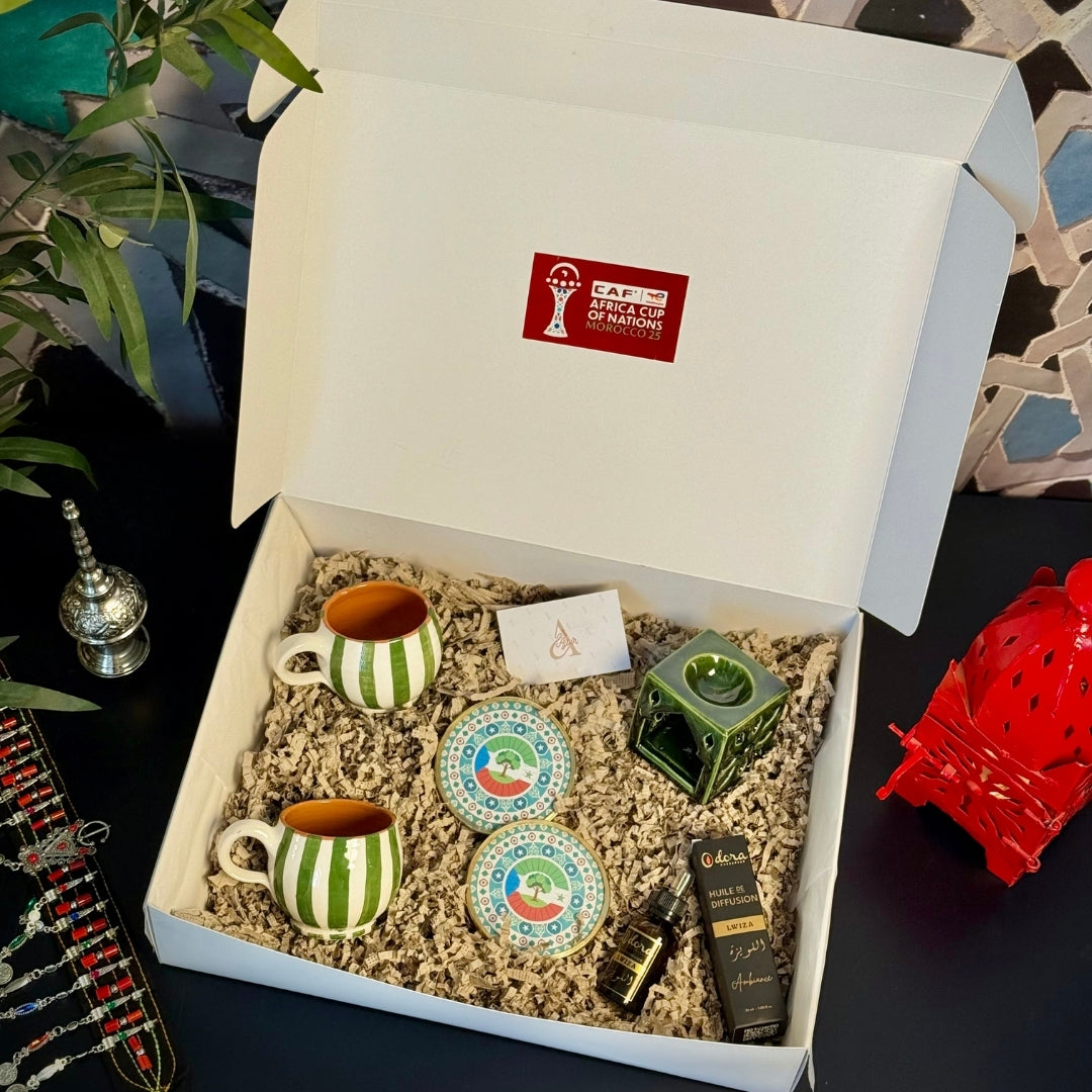 À l’occasion de la CAN 2025, ce coffret Fraîcheur Verte & Bien-Être Lwiza célèbre la Guinée Équatoriale en mariant design épuré, couleurs apaisantes et savoir-faire marocain. Pensé pour offrir un moment de détente et d’harmonie, il ravira les entreprises, agences événementielles ou particuliers cherchant un présent à la fois utile, sensoriel et symbolique.