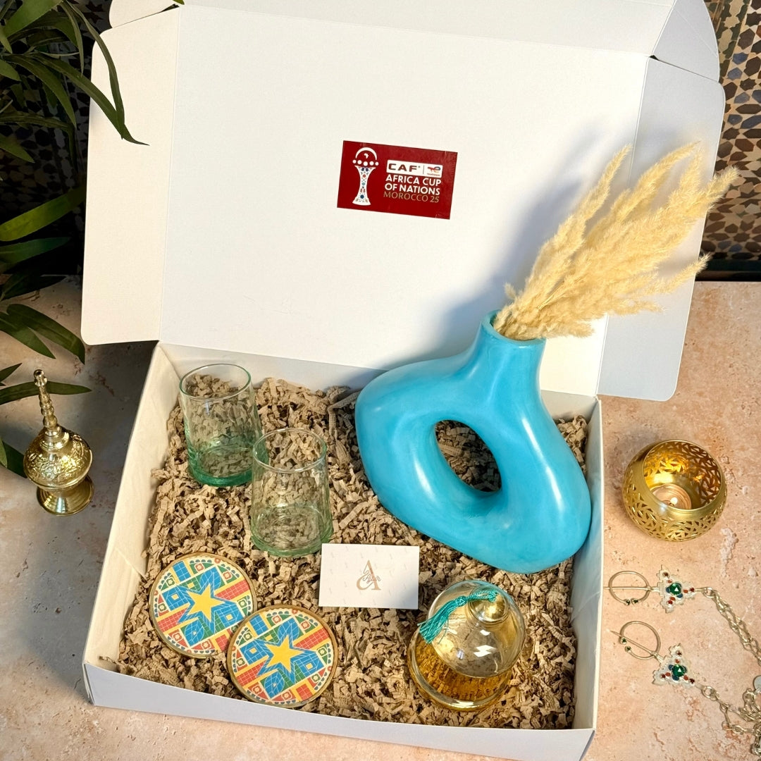 Laissez-vous envoûter par l’alliance de la douceur du bleu ciel et de l’artisanat marocain dans ce coffret. Parfait pour ceux qui recherchent un cadeau prestigieux et élégant pour les partenaires et clients à l’occasion de la CAN 2025, ce coffret allie à la fois design, tradition et raffinement.