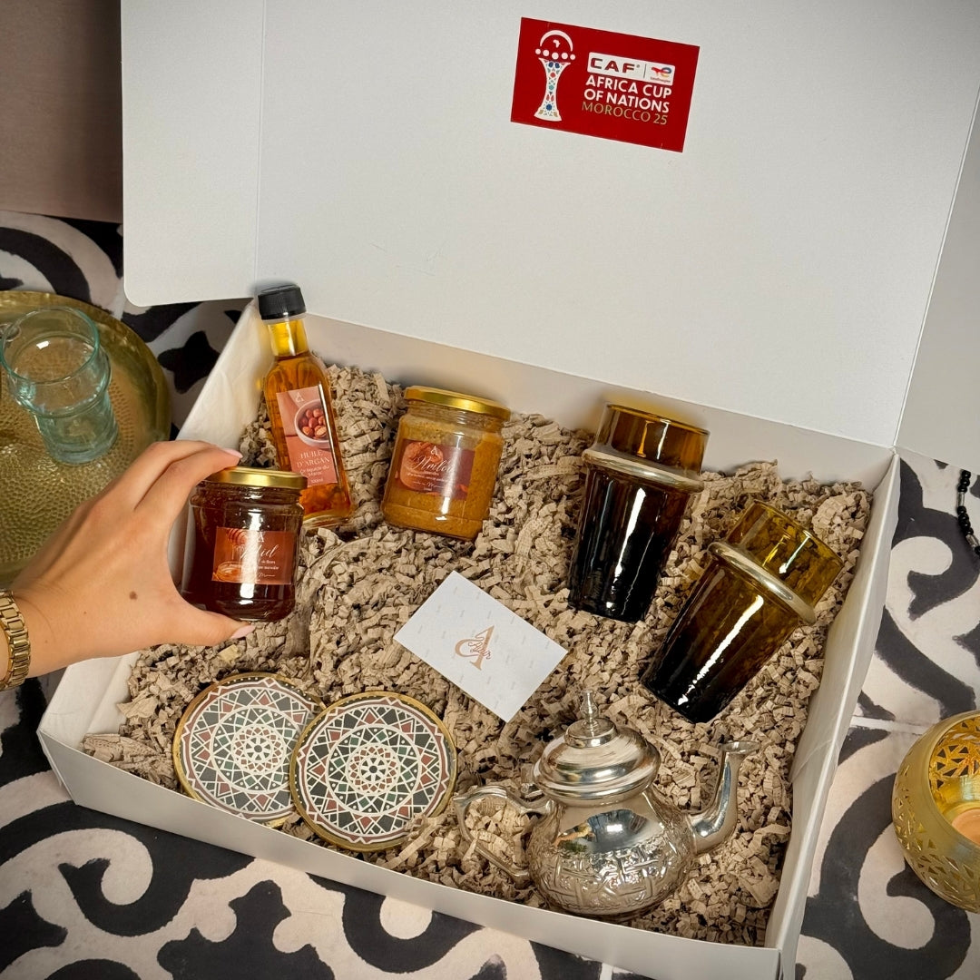 Ce coffret CAN 2025 allie avec raffinement artisanat marocain et produits naturels traditionnels, parfait pour célébrer la passion du football et l’authenticité :