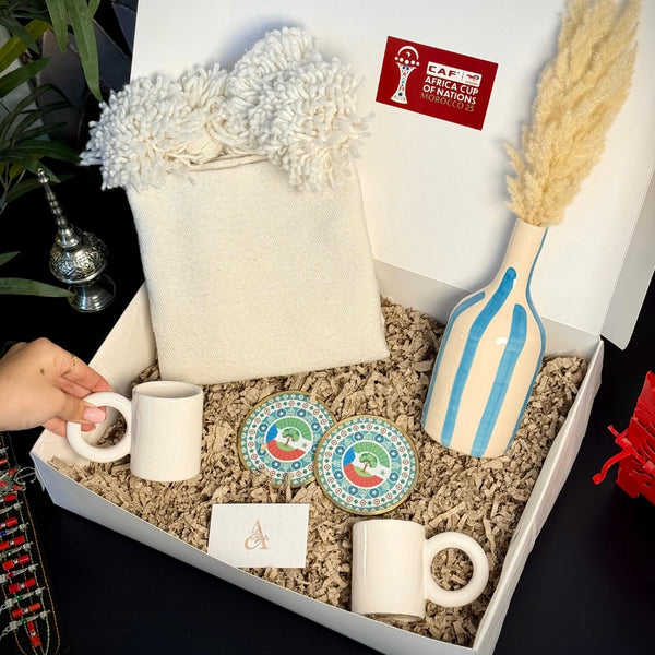 Inspiré de la pureté des tons neutres et du charme des traditions marocaines, ce coffret est un hommage à la Guinée Équatoriale, pensé pour célébrer la CAN 2025 avec raffinement. Un cadeau haut de gamme idéal pour entreprises, agences ou particuliers en quête d’une présentation soignée et symbolique.