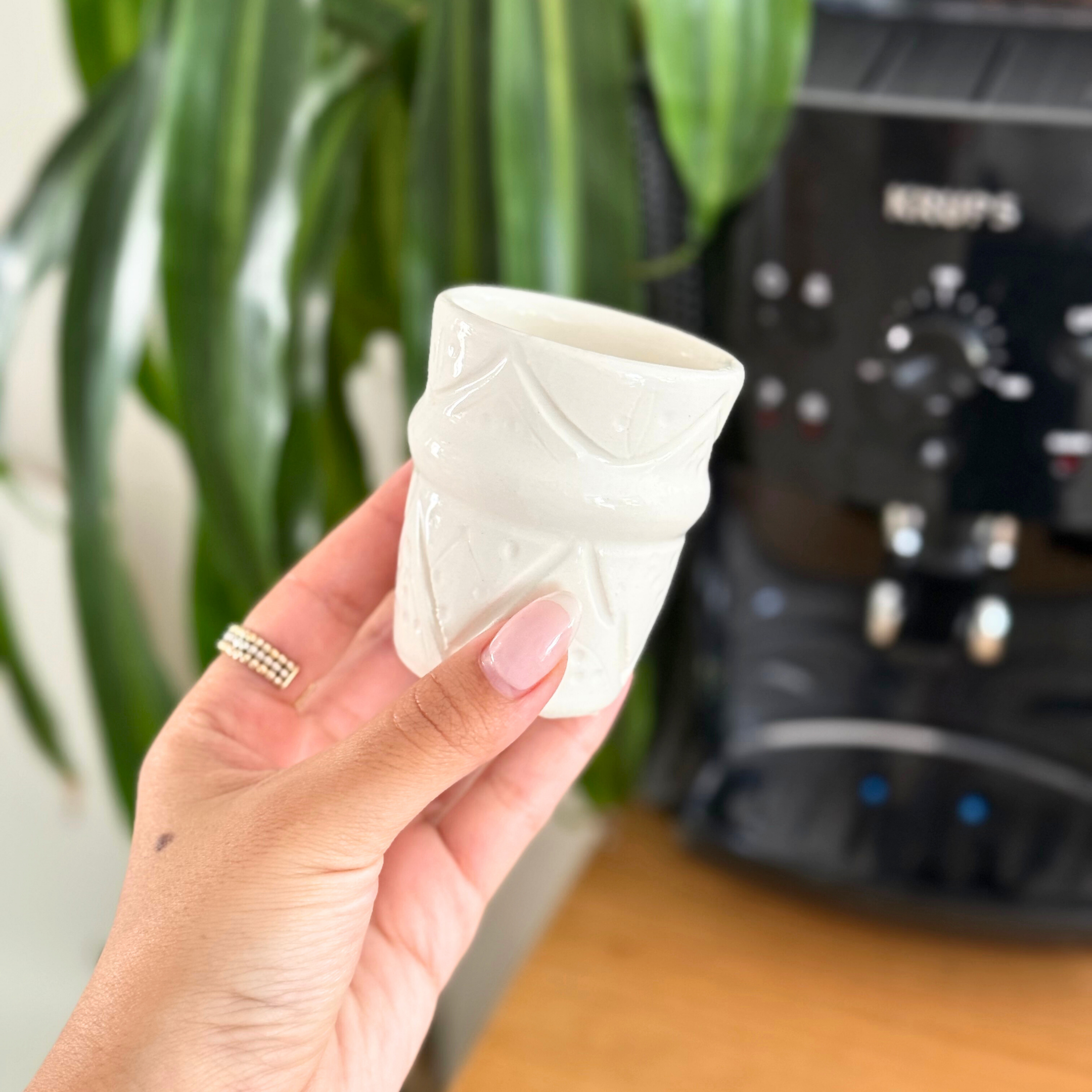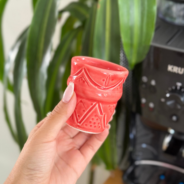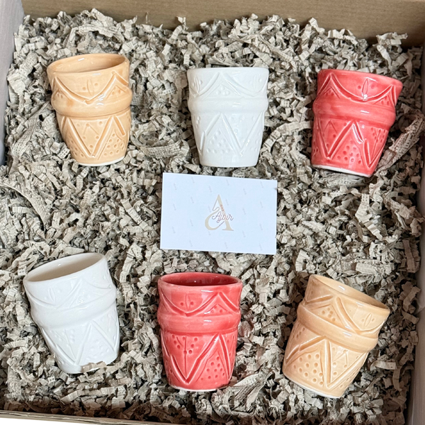 Chaque tasse révèle le charme de la céramique artisanale Ajbir : textures sculptées, finitions brillantes et nuances naturelles. Les couleurs harmonieuses — blanc, beige/nude et corail — apportent chaleur et élégance à votre table.