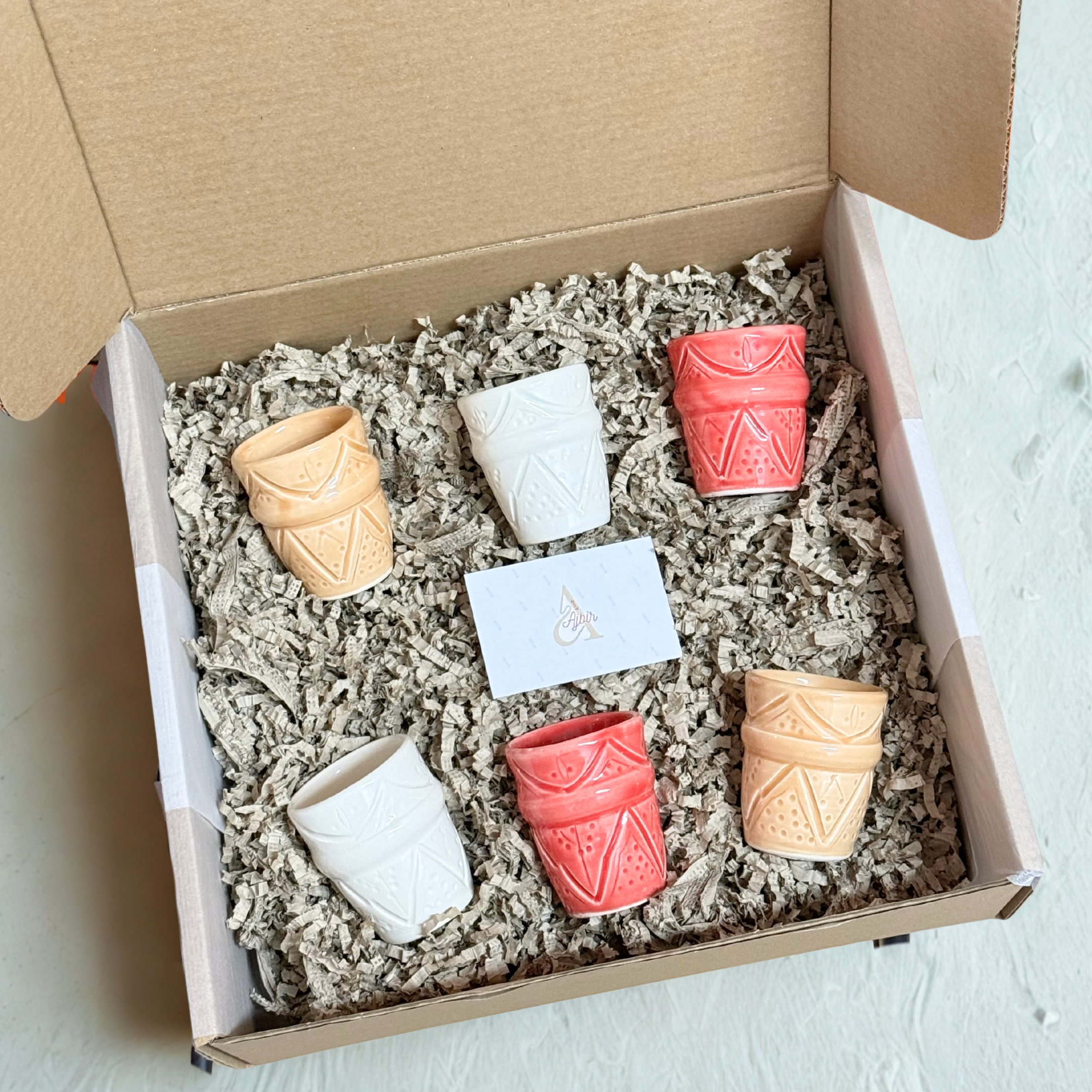 Célébrez l’artisanat marocain à travers ce coffret cadeau artisanal composé de 6 tasses en céramique, entièrement façonnées et émaillées à la main par nos artisans. Un ensemble haut en couleur et en authenticité, idéal pour sublimer vos moments de partage autour du café ou du thé.