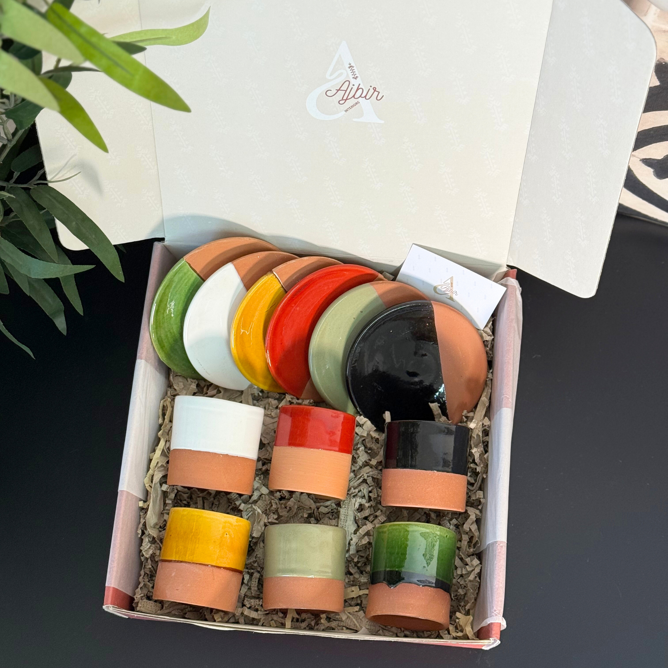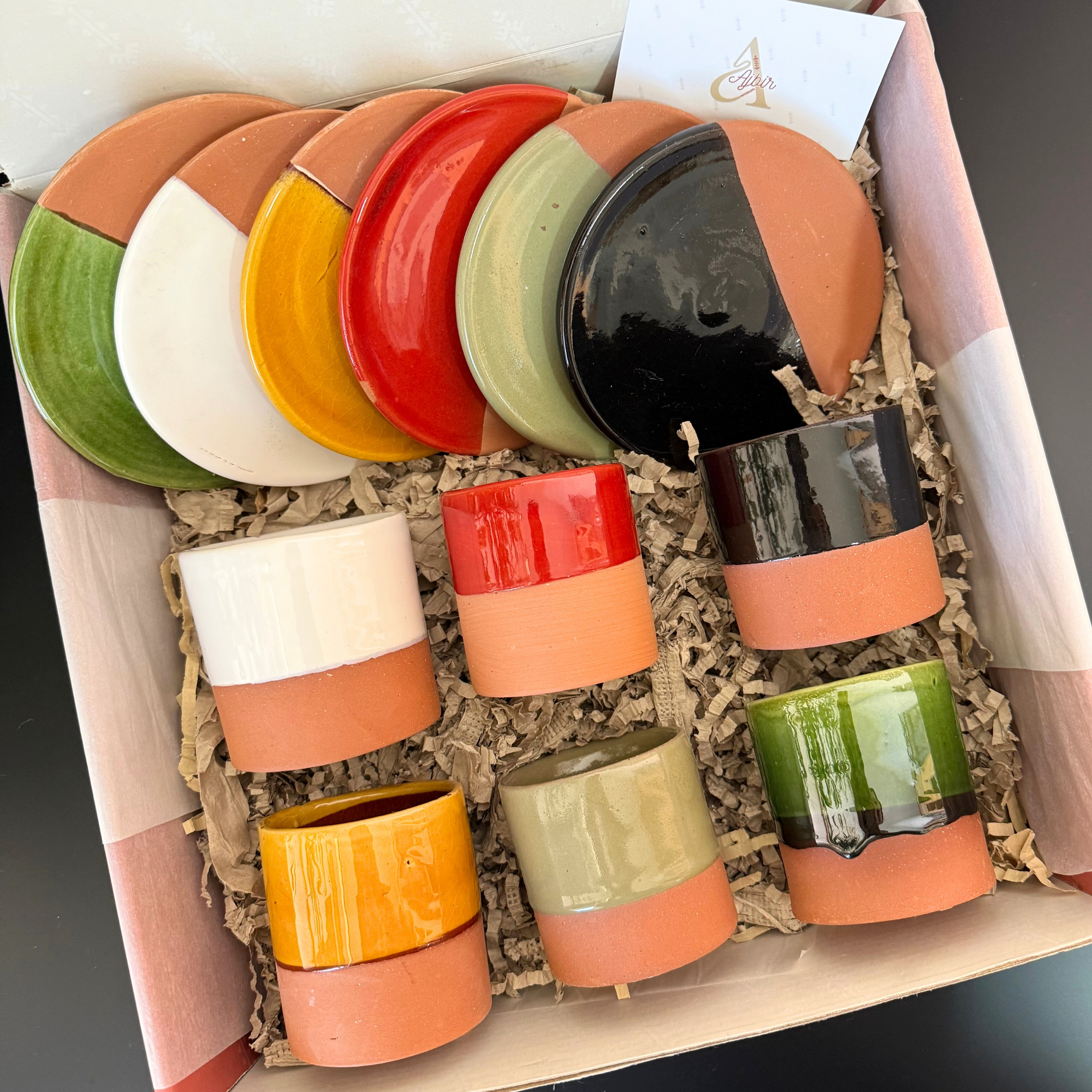 Coffret cadeau artisanal 6 tasses et sous tasses bicolores