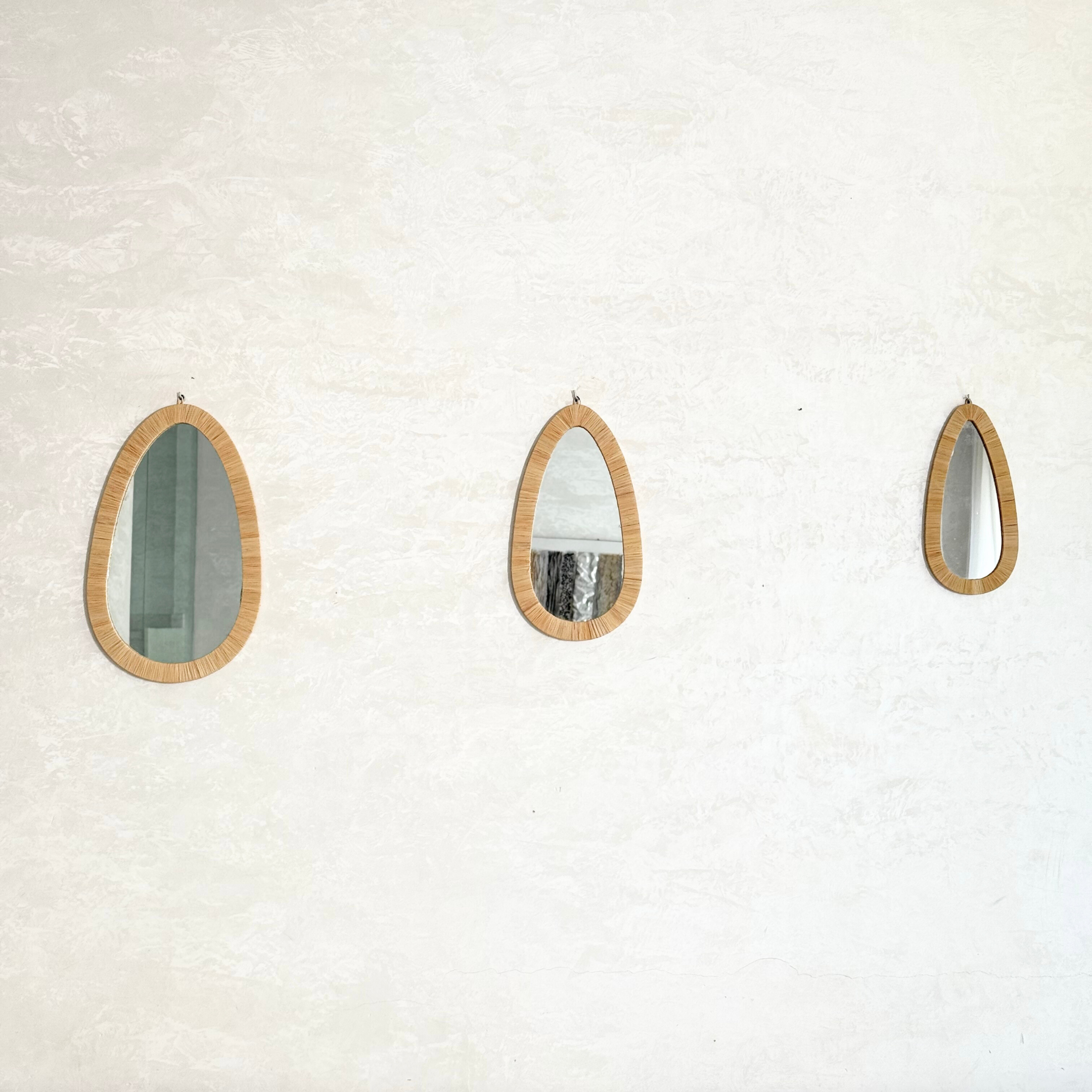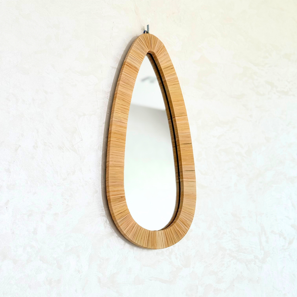 Ajoutez une touche naturelle et élégante à votre décoration avec ce miroir artisanal en forme de goutte, façonné à la main et habillé d’un cadre en fibres de raphia. Disponible en trois tailles (petit, moyen, grand), ce miroir mural décoratif s’intègre facilement à tous les styles : bohème chic, minimaliste, scandinave ou contemporain.