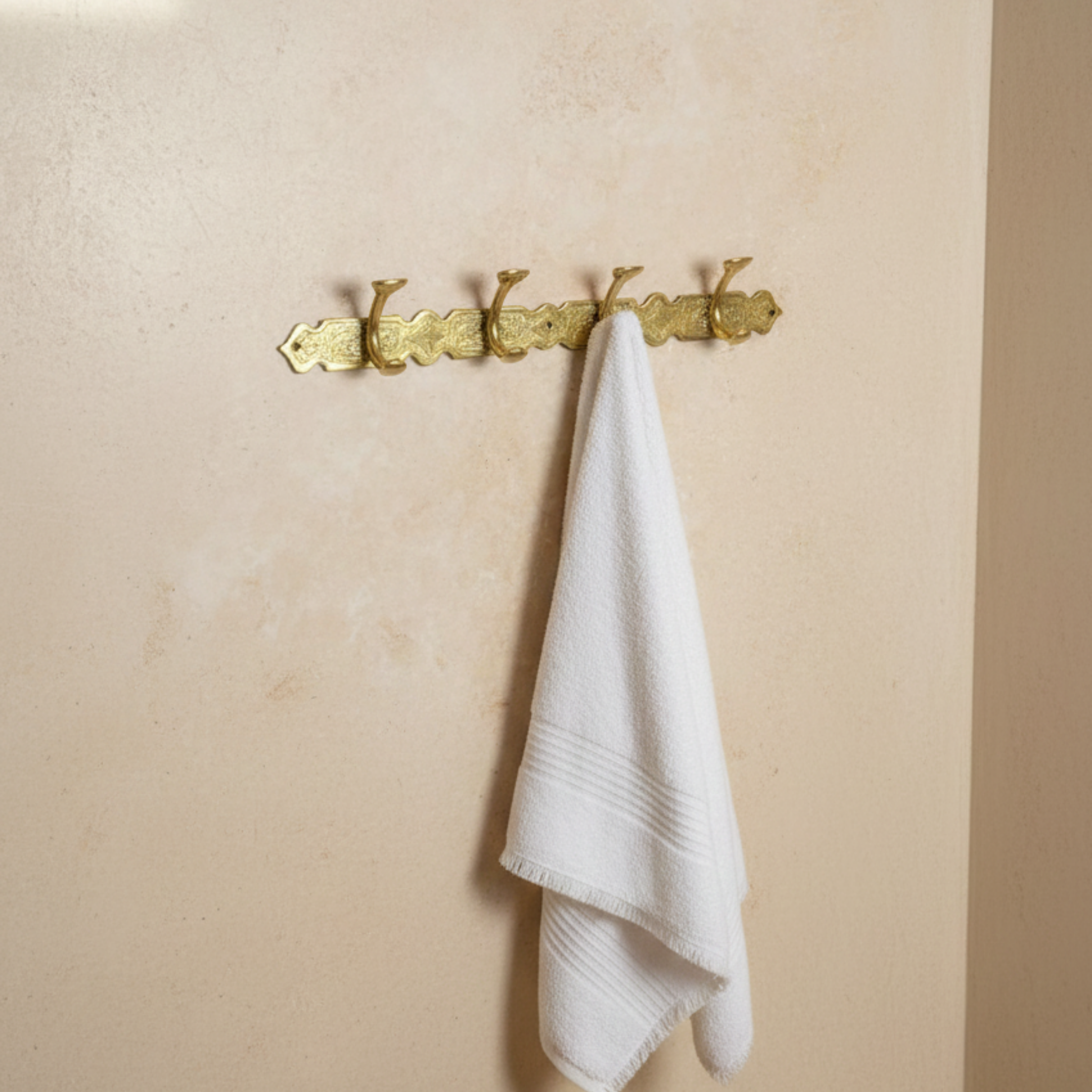 La barre murale Zwak est un accessoire artisanal en laiton doré, pensé pour allier fonctionnalité et esthétique. Composée de 4 crochets robustes, elle permet d’organiser avec élégance serviettes, peignoirs, sacs, accessoires ou vêtements du quotidien.