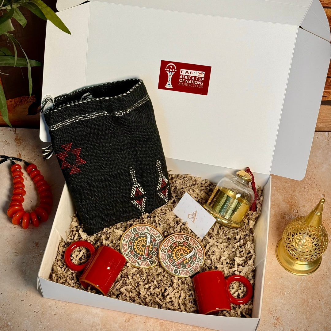 Ajbir vous propose un coffret Angola à l'esthétique puissante et contemporaine, qui rend hommage aux couleurs emblématiques du pays à travers l’artisanat marocain haut de gamme. Pensé pour les cadeaux d’entreprise ou d’exception à l’occasion de la CAN 2025, ce coffret associe élégance textile, utilité raffinée et symbolisme décoratif.