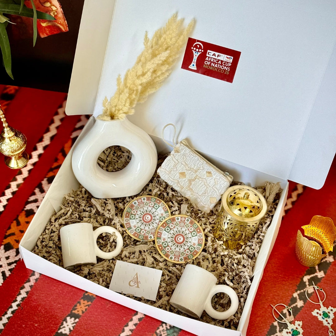 Ce coffret incarne la pureté et l’élégance, en hommage à la Tunisie dans une version blanche et dorée résolument chic. Composé d’objets artisanaux marocains raffinés, il est idéal pour les entreprises, agences événementielles, institutions et professionnels de l’image dans le cadre de la CAN 2025.