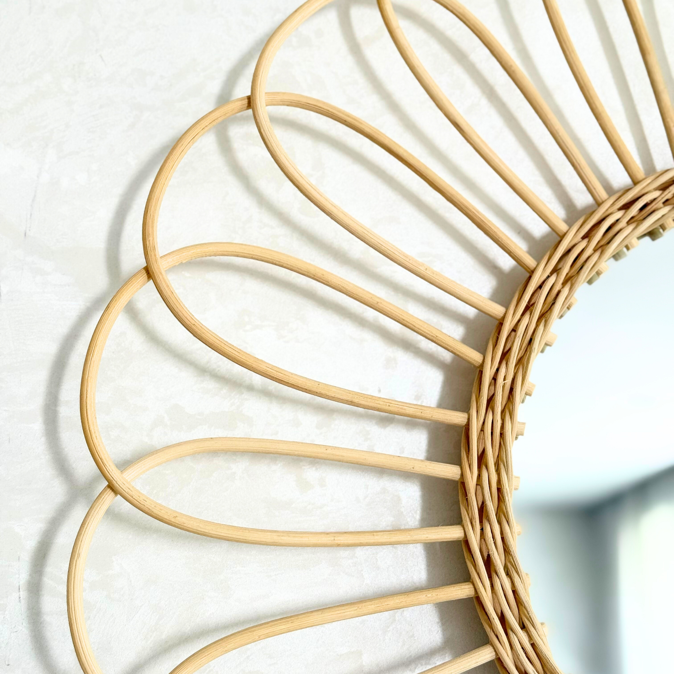 Éclairez votre intérieur avec le Miroir Tayourt, une pièce artisanale inspirée du soleil marocain. Réalisé à la main en rotin naturel, ce miroir mural au design floral apporte douceur, lumière et authenticité à vos espaces.