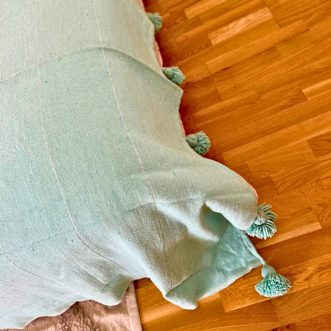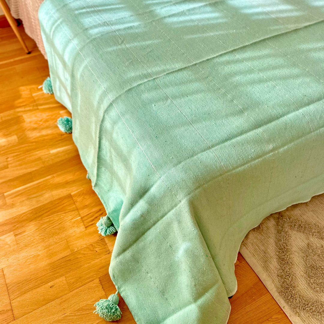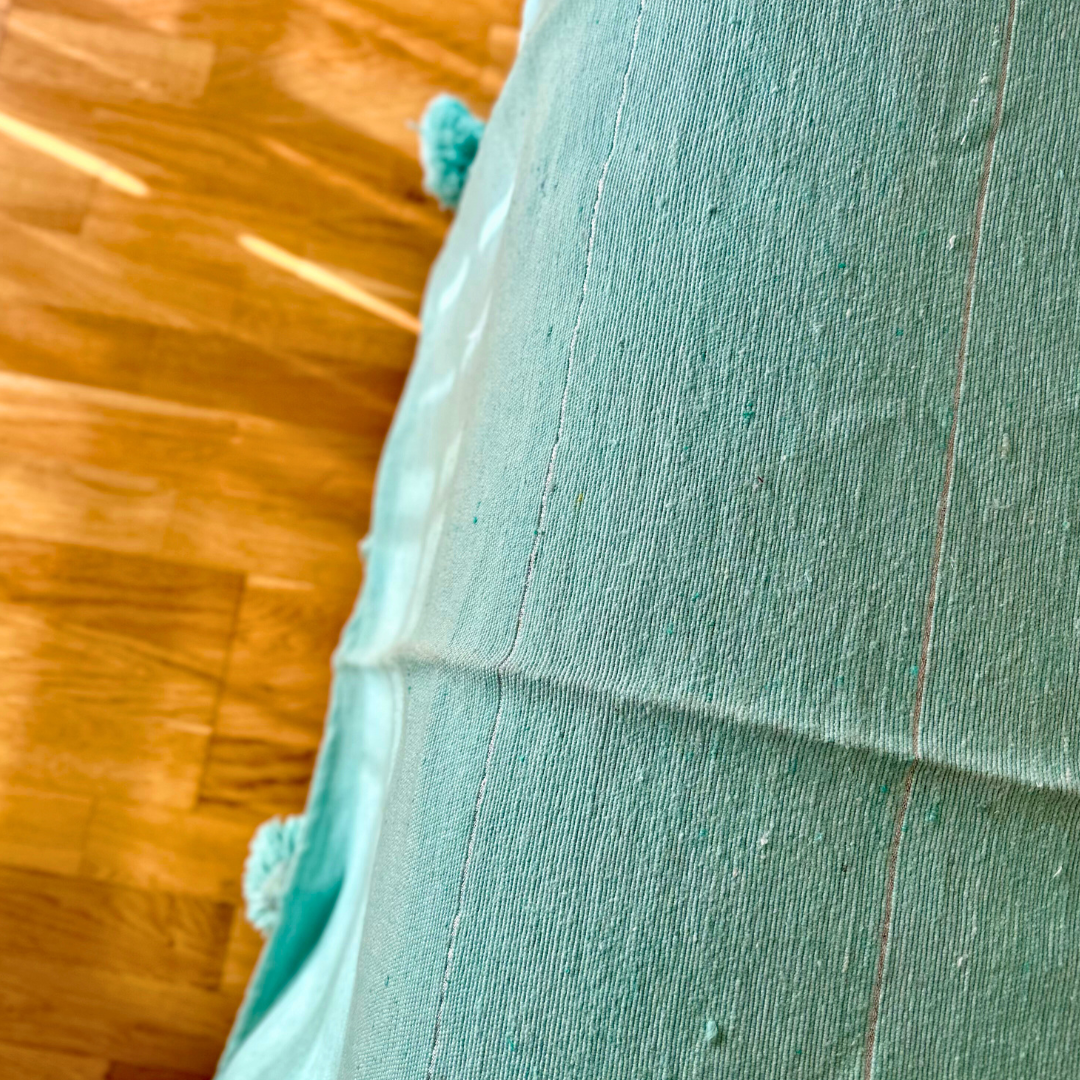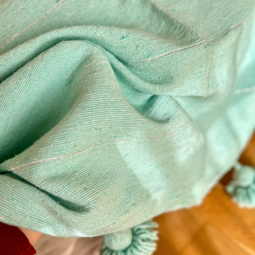 Apportez une touche d’éclat à votre décoration avec ce plaid artisanal turquoise orné d’un élégant liseré argenté. Confectionné à la main dans la plus pure tradition marocaine, il séduit par ses finitions raffinées et ses pompons noués à la main, qui lui confèrent un charme authentique.