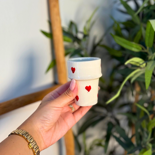 Découvrez notre magnifique petit verre aux petits cœurs rouges, entièrement faite à la main par des artisans marocains. Son design unique et sa qualité artisanale ajoutent une touche d'élégance à vos moments de détente autour d'un bon café. Fait à la main, chaque tasse est unique et apporte une touche d'authenticité à votre cuisine.