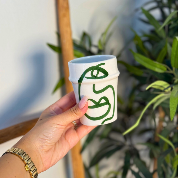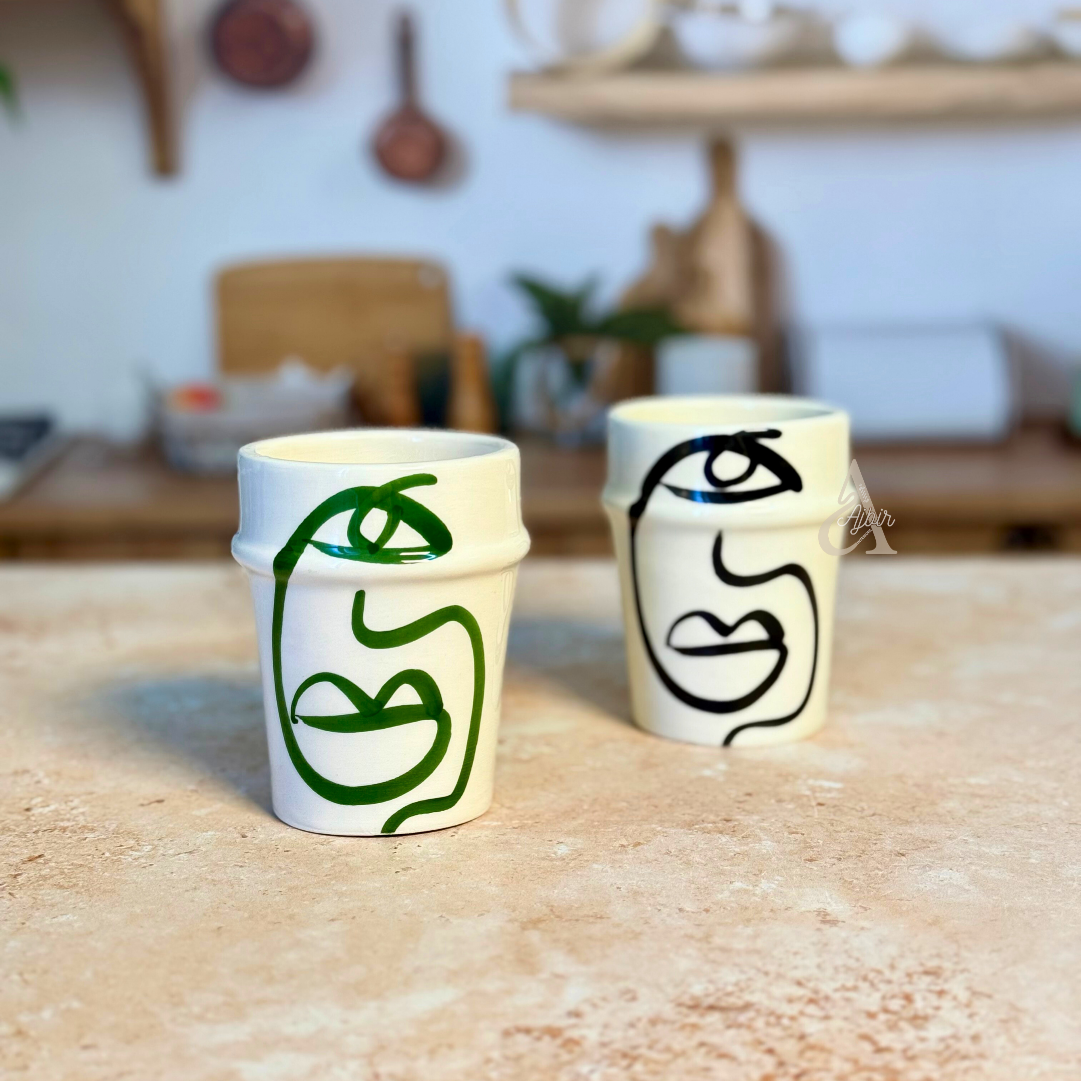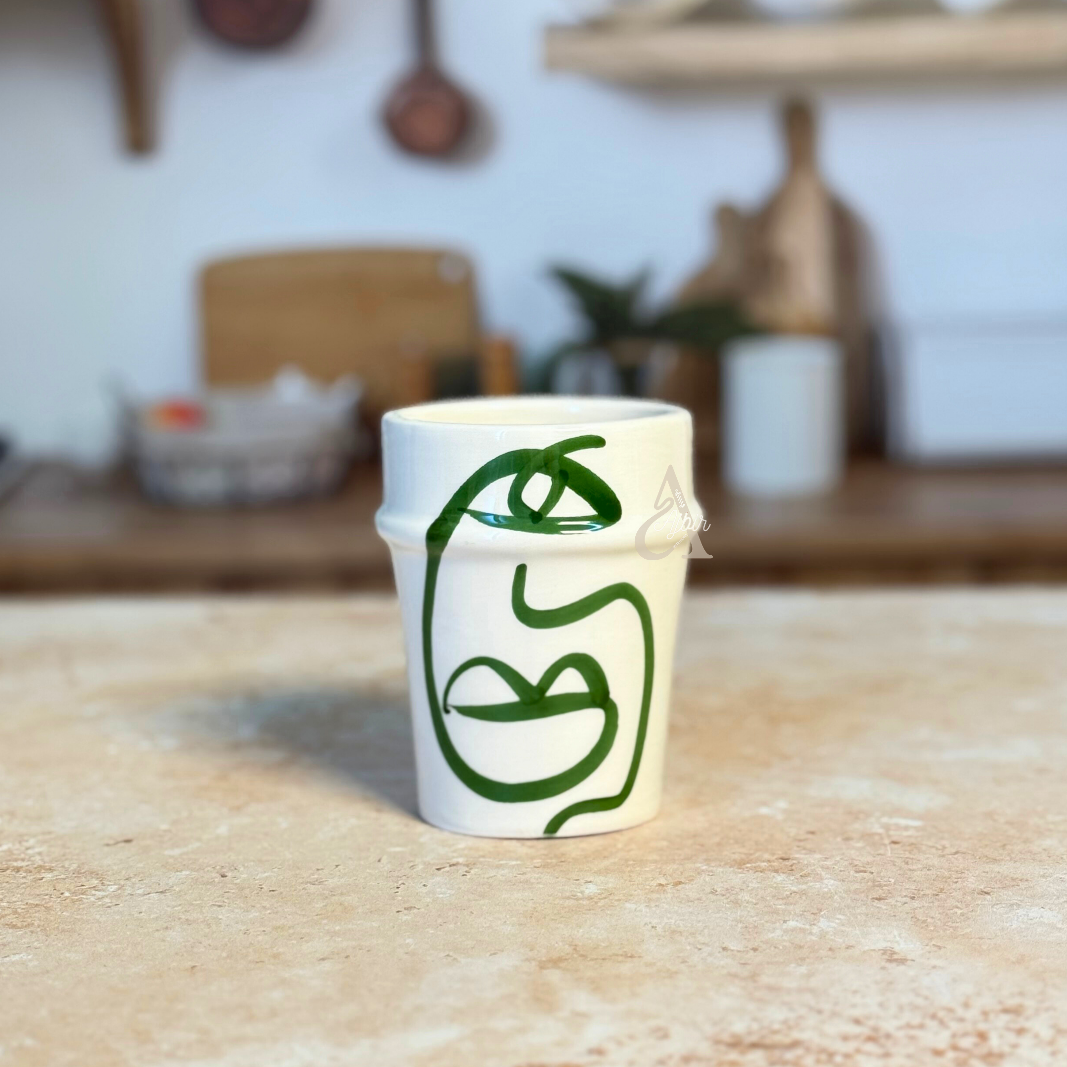 Chaque verre est réalisé en céramique blanche, émaillé puis peint à la main en deux déclinaisons : noir profond ou vert palmier. Sa forme légèrement resserrée et son rebord travaillé offrent une prise en main confortable et un style résolument Ajbir Interiors, où l’art rencontre l’authenticité.