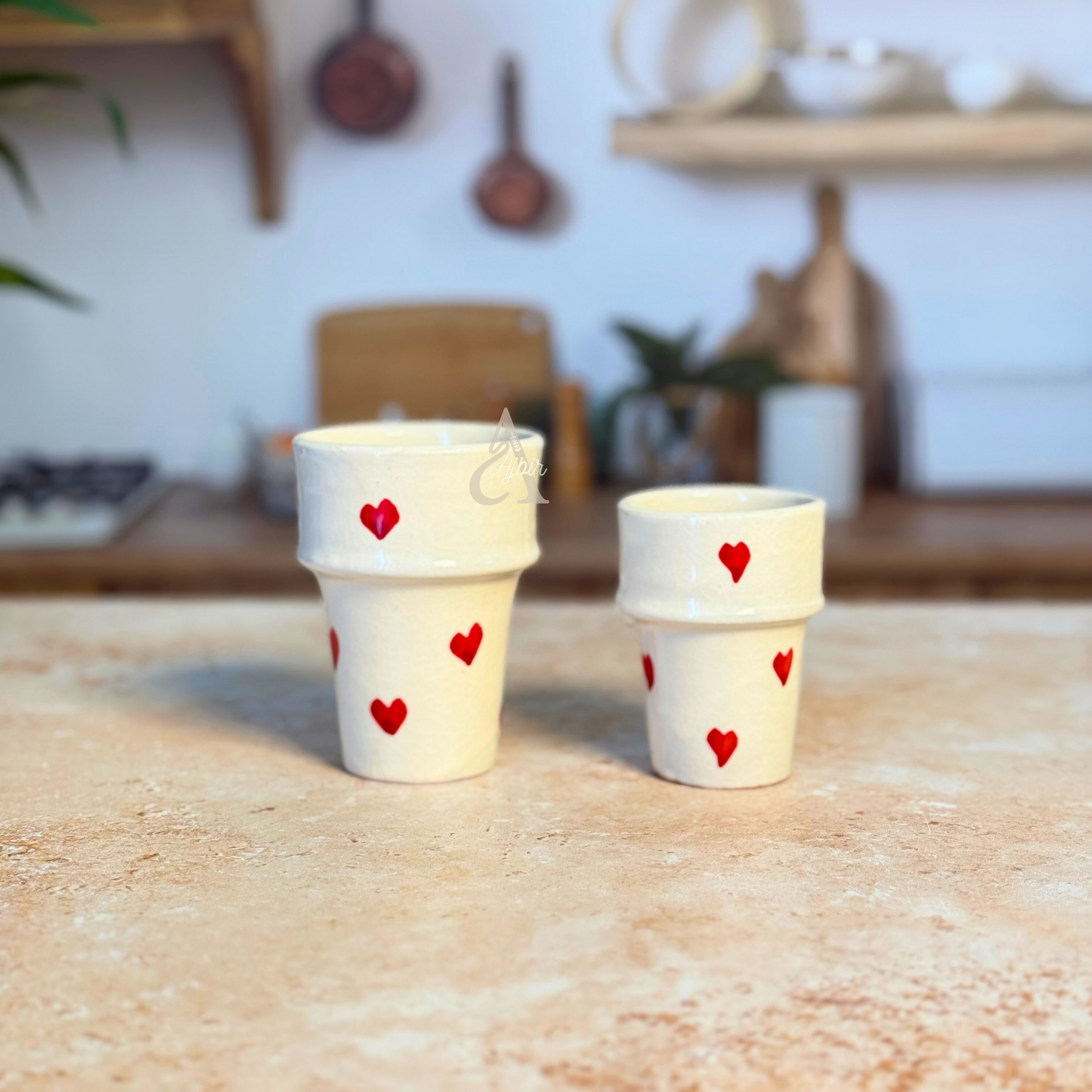 Découvrez notre magnifique verre aux petits cœurs rouges, entièrement faite à la main par des artisans marocains. Son design unique et sa qualité artisanale ajoutent une touche d'élégance à vos moments de détente autour d'un bon café. Fait à la main, chaque tasse est unique et apporte une touche d'authenticité à votre cuisine.
