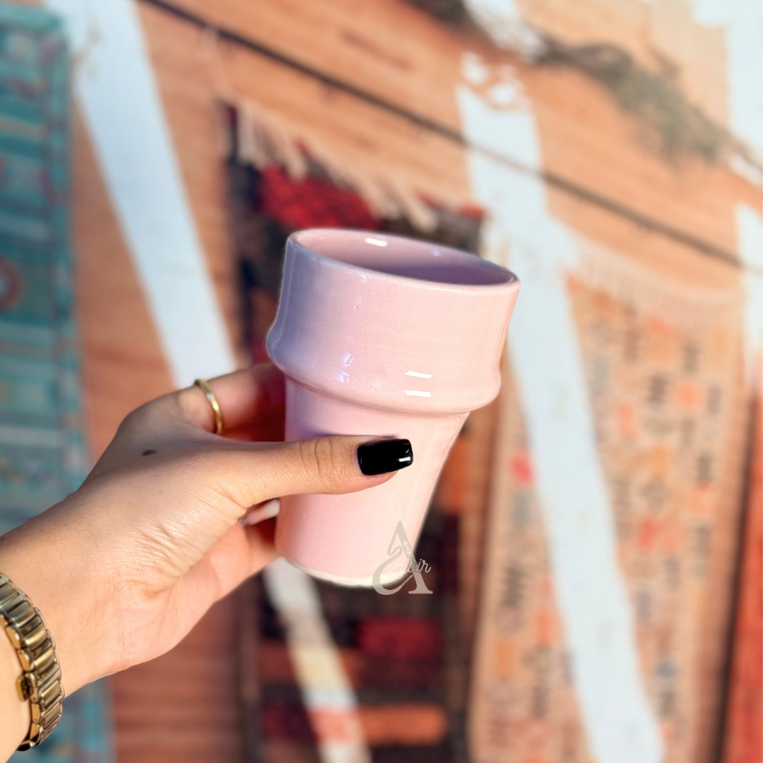 Ce grand verre beldi en céramique artisanale rose incarne l’élégance simple et chaleureuse de l’art de la table marocain. Entièrement façonné à la main, il reprend la forme emblématique du verre beldi traditionnel, revisitée ici dans une finition émaillée douce et contemporaine.
