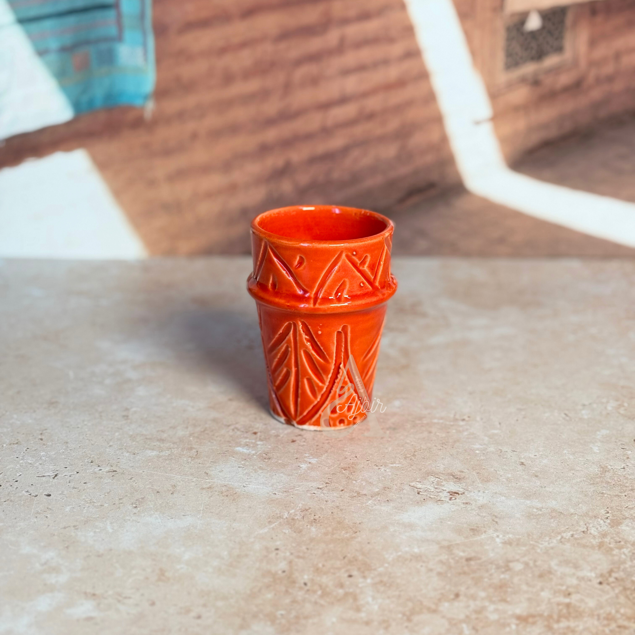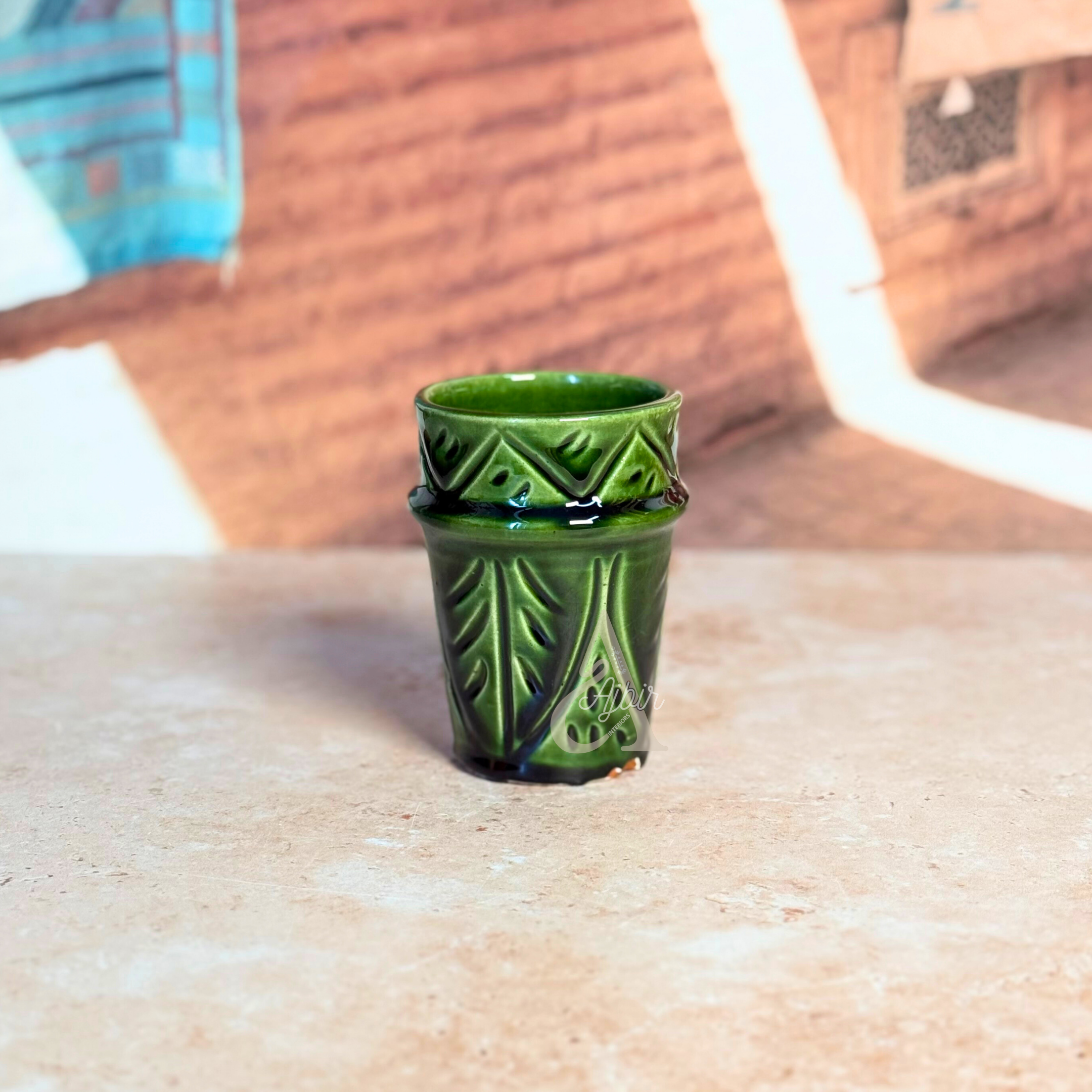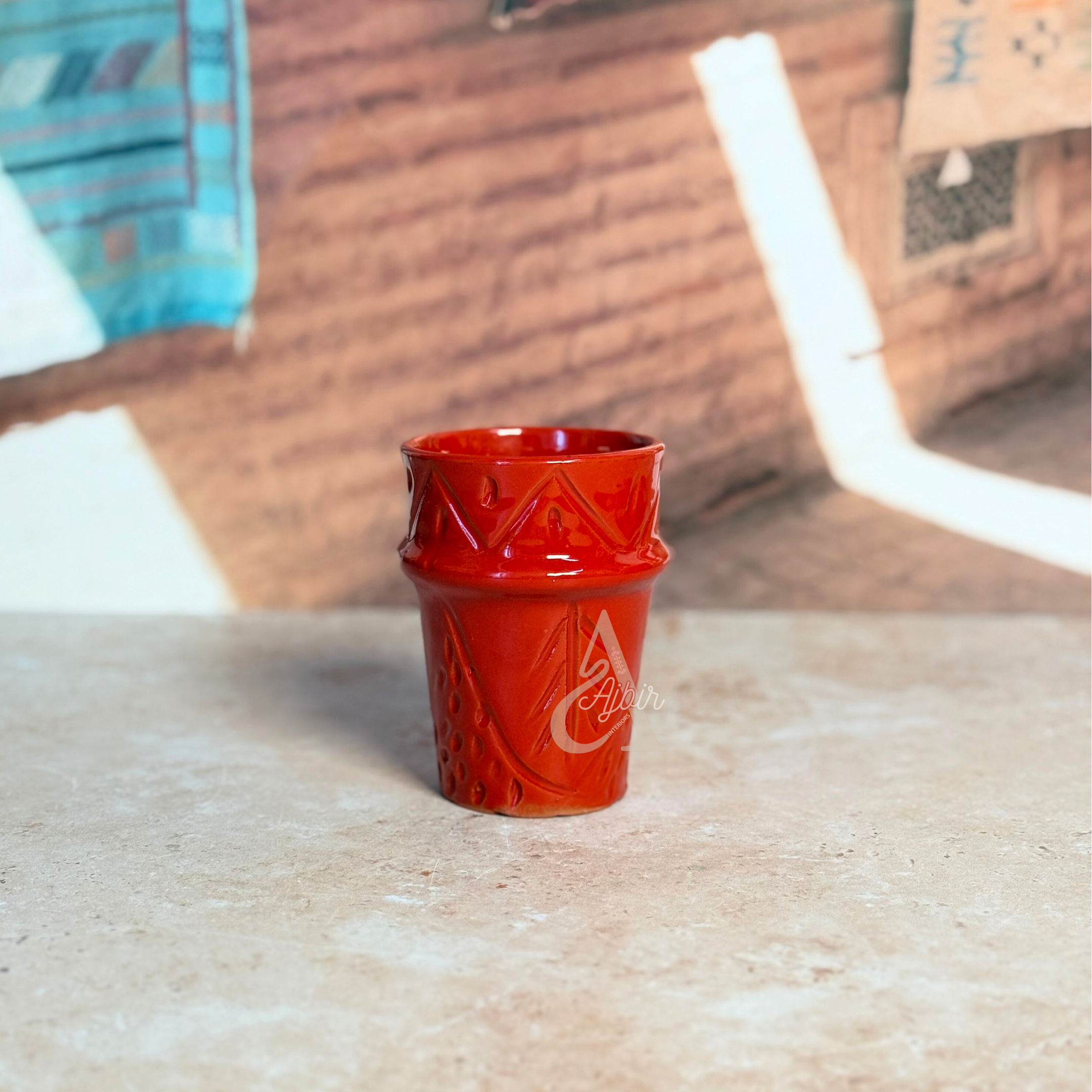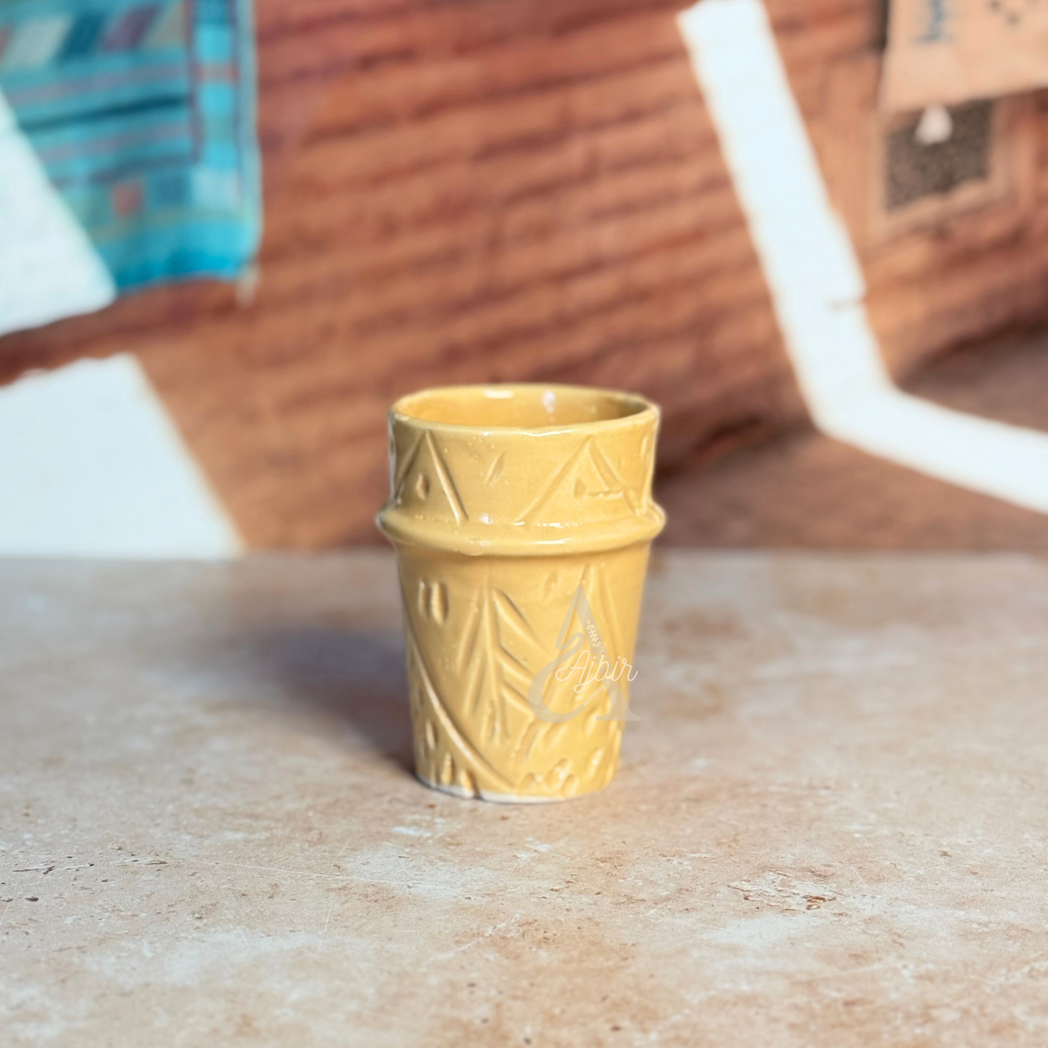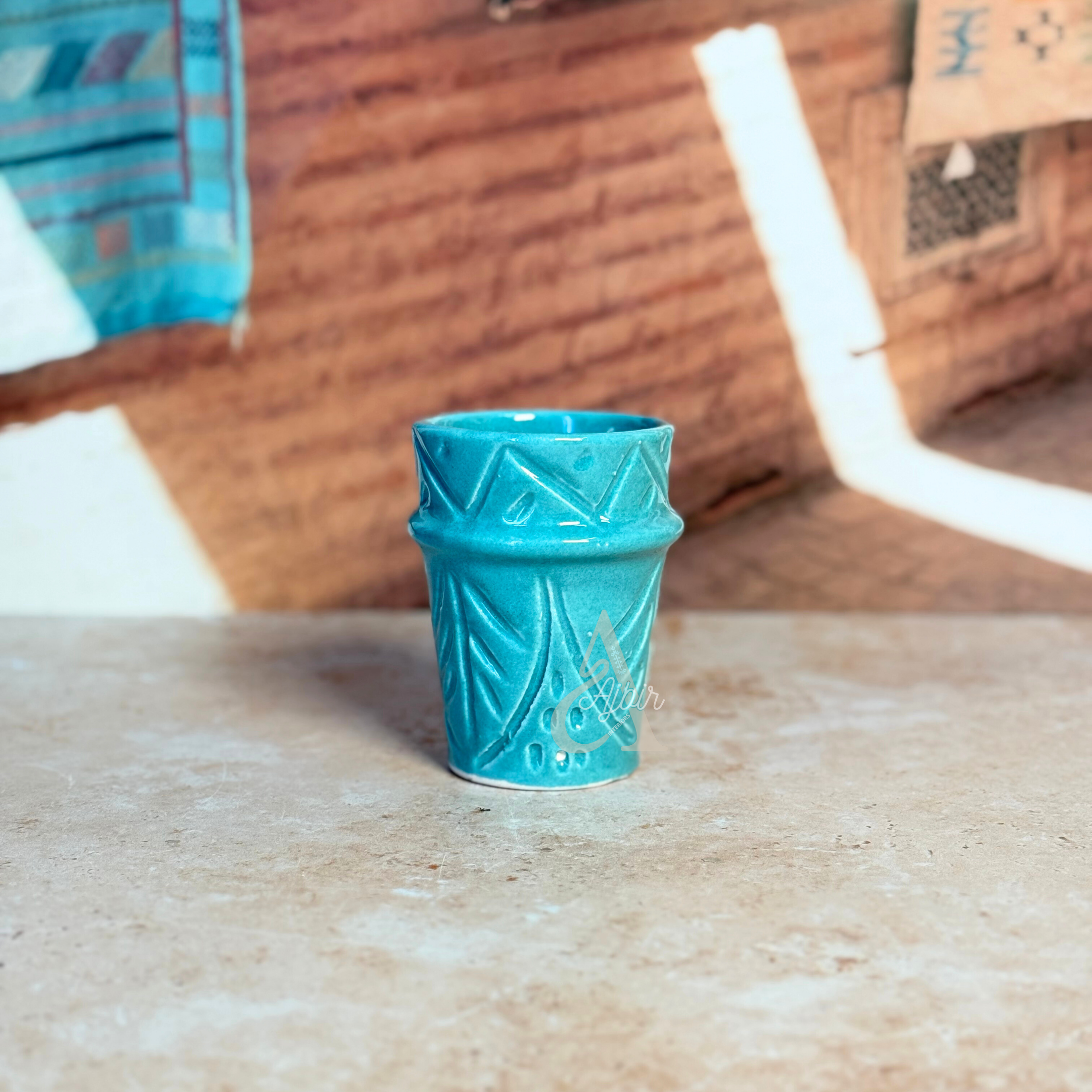 Découvrez le verre Tizwelt vernis, une pièce unique de l’artisanat marocain, fabriquée à la main en terre cuite avec une décoration originale d'empreintes colorées. Sa finition vernie brillante met en valeur les motifs subtils, créant un verre à la fois fonctionnel et esthétique. Idéal pour vos boissons chaudes ou froides, il apporte une touche authentique et moderne à vos moments de dégustation.