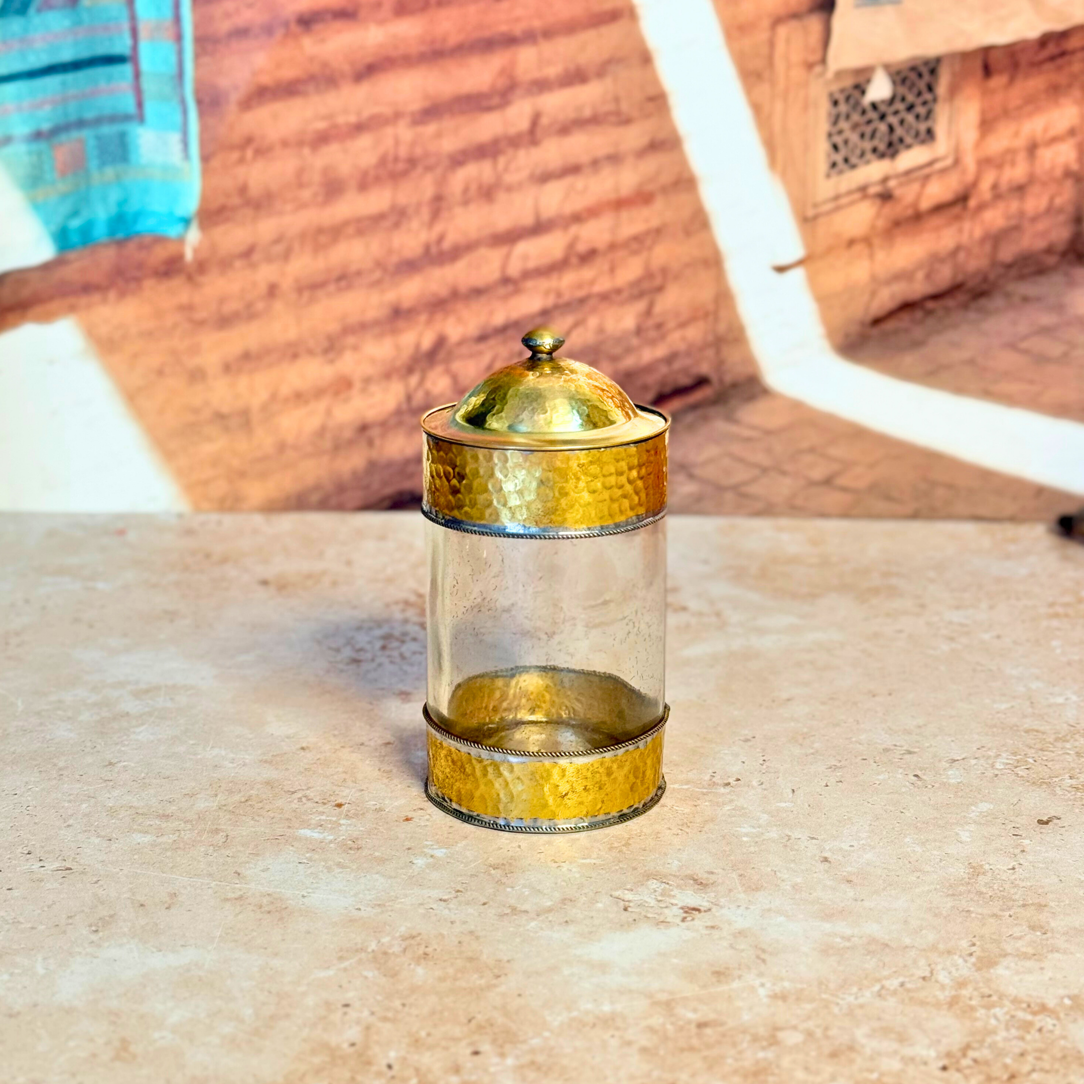 Cette boîte en verre et laiton doré séduit par son design raffiné mêlant transparence et métal martelé. Le corps en verre laisse apparaître le contenu avec élégance, tandis que les finitions en laiton doré, travaillées à la main, apportent une touche précieuse et chaleureuse.