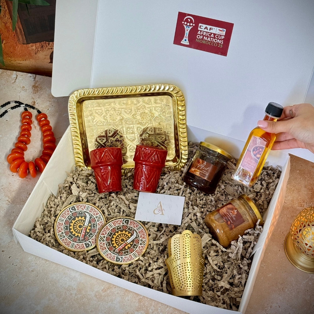 Dans le cadre de la CAN 2025, Ajbir signe un coffret Angola célébrant les richesses gustatives et l’élégance artisanale du Maroc. Pensé pour les agences, entreprises ou particuliers à la recherche d’un cadeau d’exception, ce coffret marie les saveurs authentiques marocaines aux objets décoratifs nobles, dans un esprit d’échange culturel raffiné.