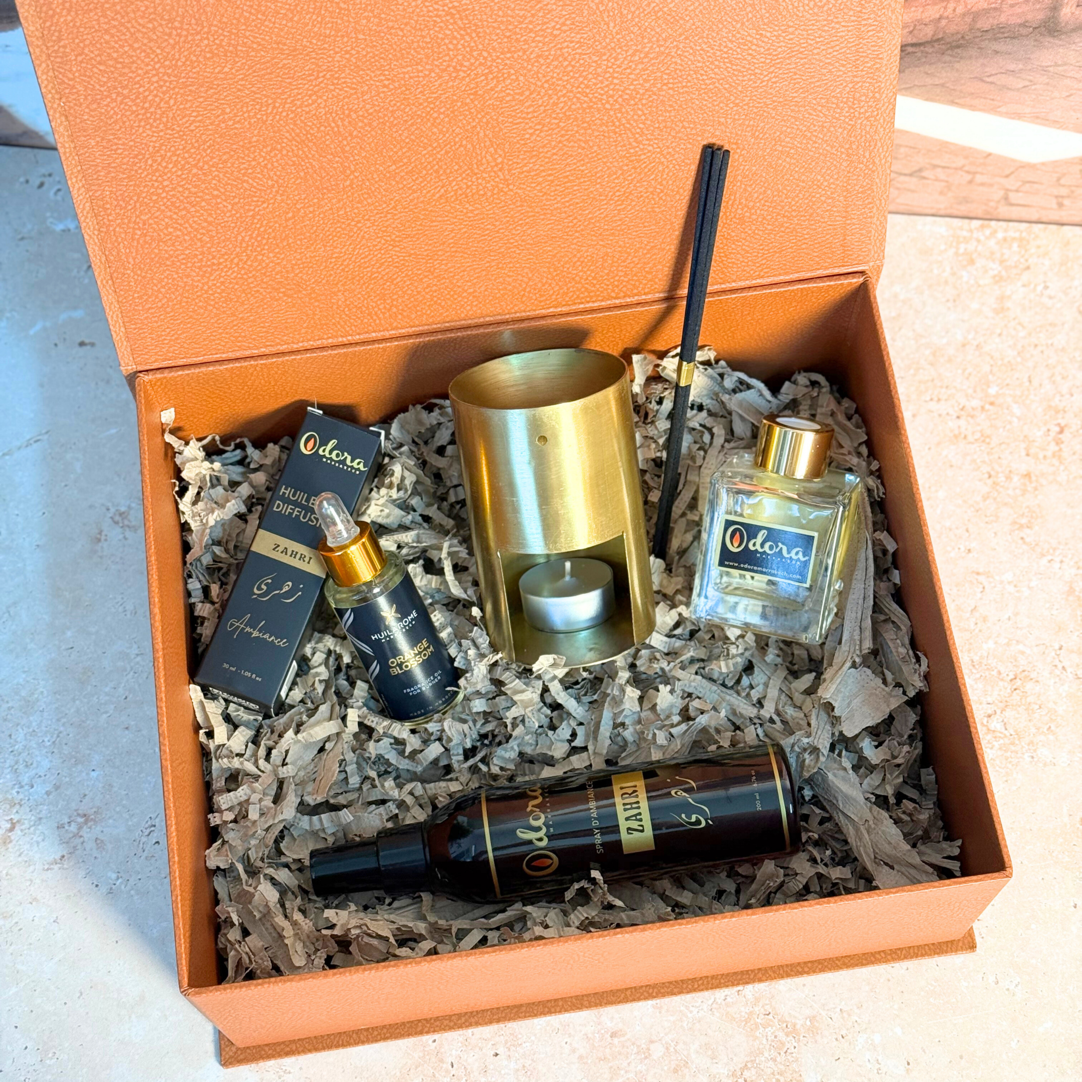 Le Coffret Prestige ZAHRA est une invitation à la détente et au raffinement. Conçu comme un rituel parfumé complet, il sublime les intérieurs grâce à la chaleur du laiton doré et à la délicatesse intemporelle de la fleur d’oranger.
