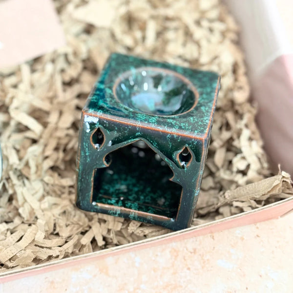 Un brûleur à encens ou à huile essentielle, en céramique émaillée turquoise, pour créer une ambiance zen et parfumée à la maison.