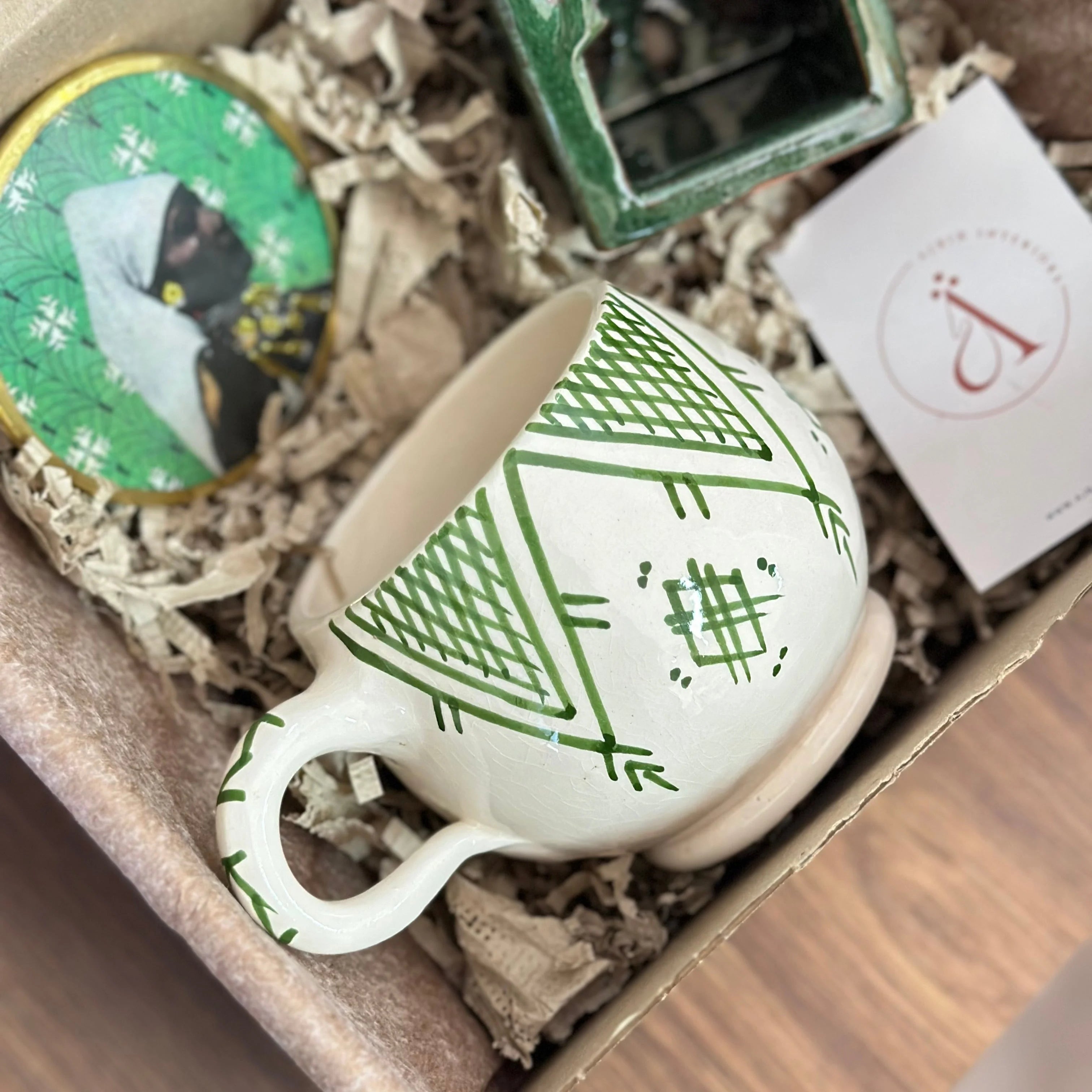 - Un mug en céramique aux motifs Nakch vert : Inspiré des motifs traditionnels marocains appelés "Nakch", ce mug en céramique peinte à la main se distingue par ses tons verts éclatants, apportant une touche chaleureuse et raffinée à chaque pause café ou thé.