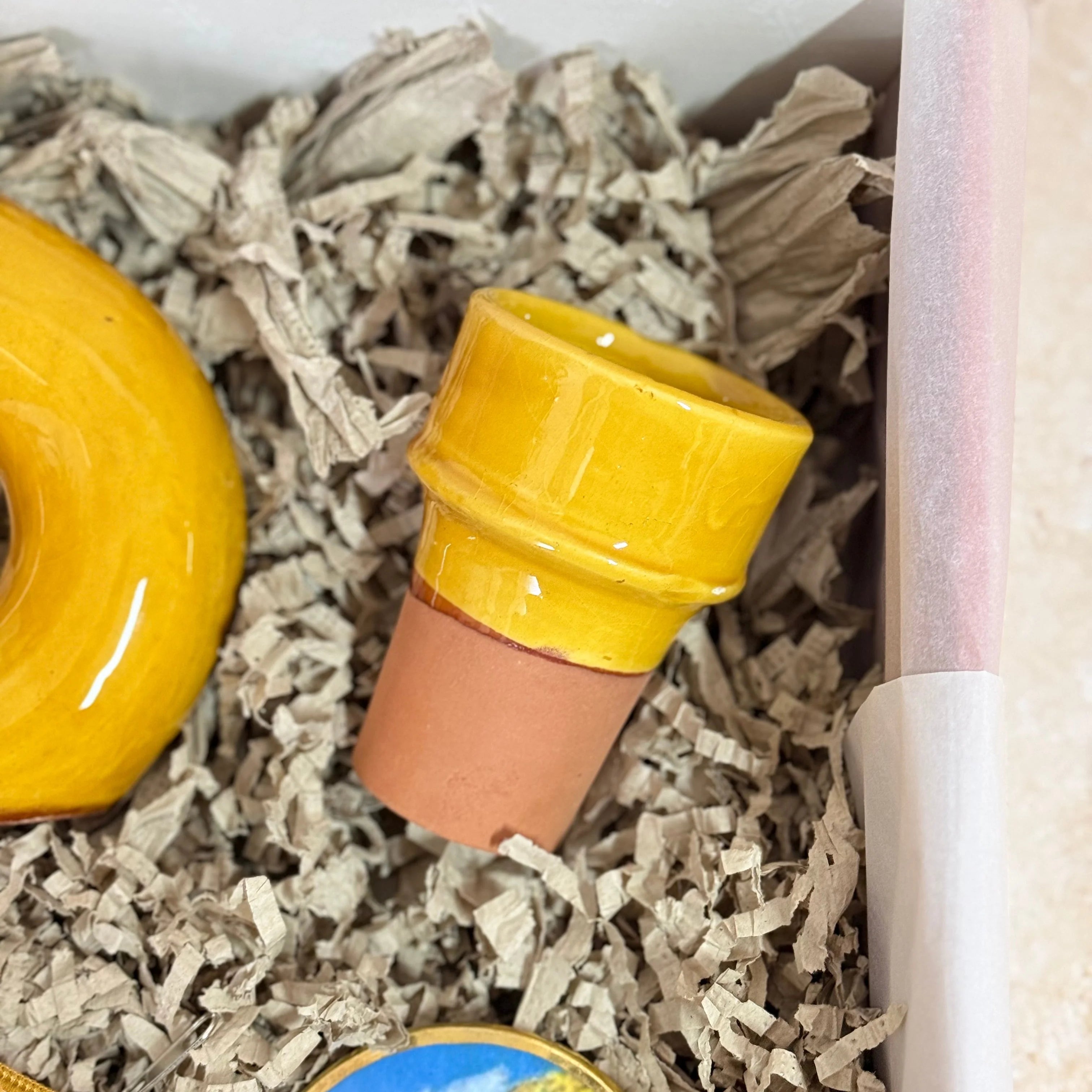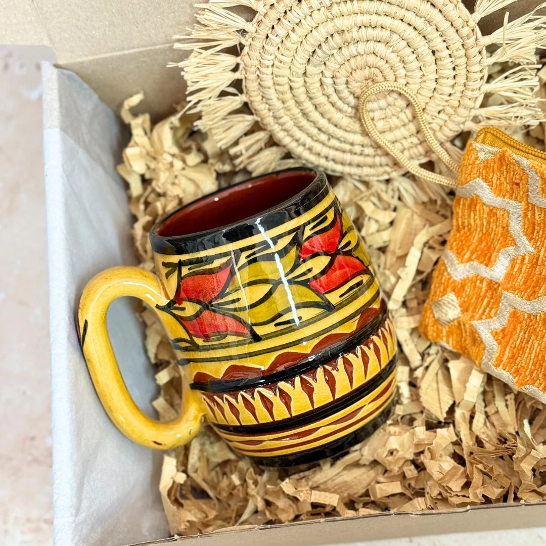 - Un mug en céramique Nakch jaune : Inspiré des motifs traditionnels marocains appelés "Nakch", ce mug en céramique peinte à la main se distingue par ses tons jaunes éclatants, apportant une touche chaleureuse et raffinée à chaque pause café ou thé.