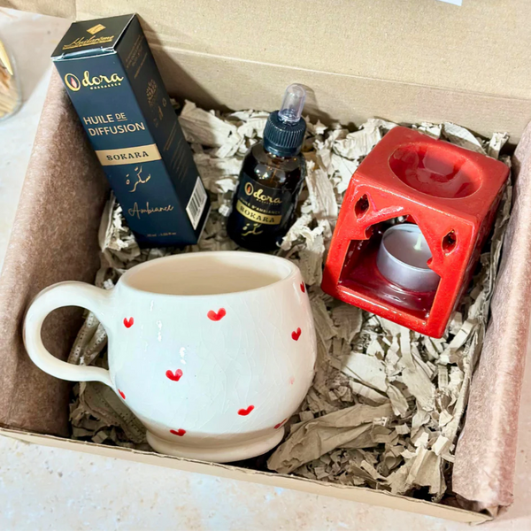 - Couleurs : Blanc pur avec motifs rouges pour le mug, rouge intense pour le diffuseur.