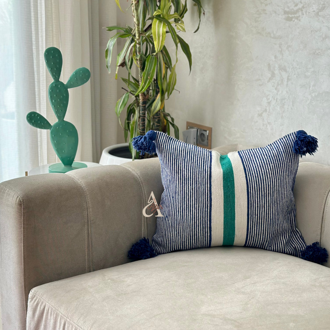 Ajoutez une note colorée et joyeuse à votre intérieur avec notre housse de coussin artisanale à pompons blanc à à rayures bleu et vert . Confectionnée à la main par des artisans marocains, cette housse en coton de haute qualité offre un équilibre parfait entre authenticité et modernité. Ses dimensions pratiques de 50x40 cm la rendent idéale pour habiller un canapé, un fauteuil ou un lit. Les pois moutarde et rose apportent une touche ludique et élégante, tandis que les pompons faits main ajoutent une finition chaleureuse. Ce modèle unique est parfait pour une décoration bohème, contemporaine ou éclectique.