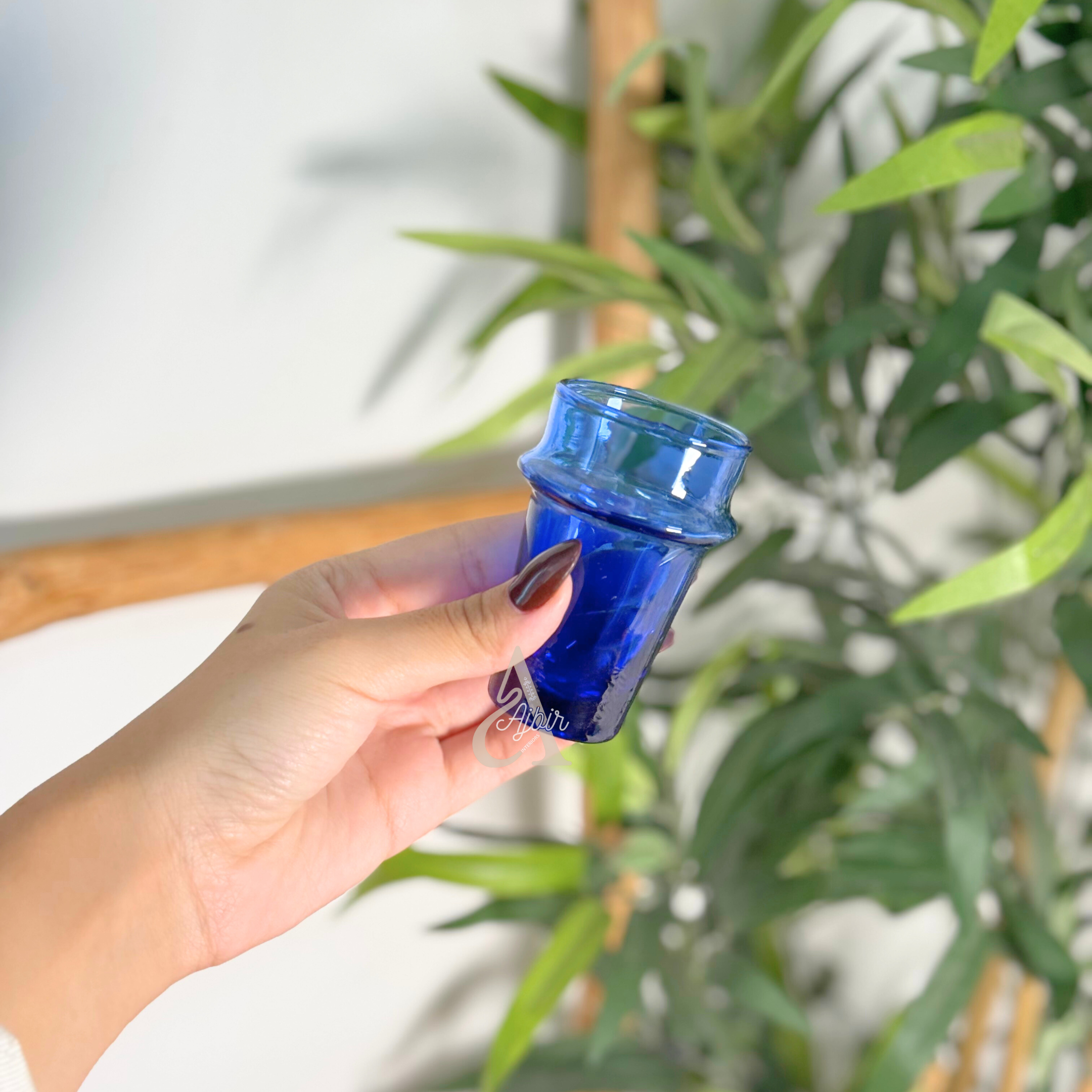 Savourez vos cafés et expressos dans une touche d’élégance artisanale avec ce set de 6 verres espresso beldi bleus, soufflés à la bouche selon la tradition marocaine.