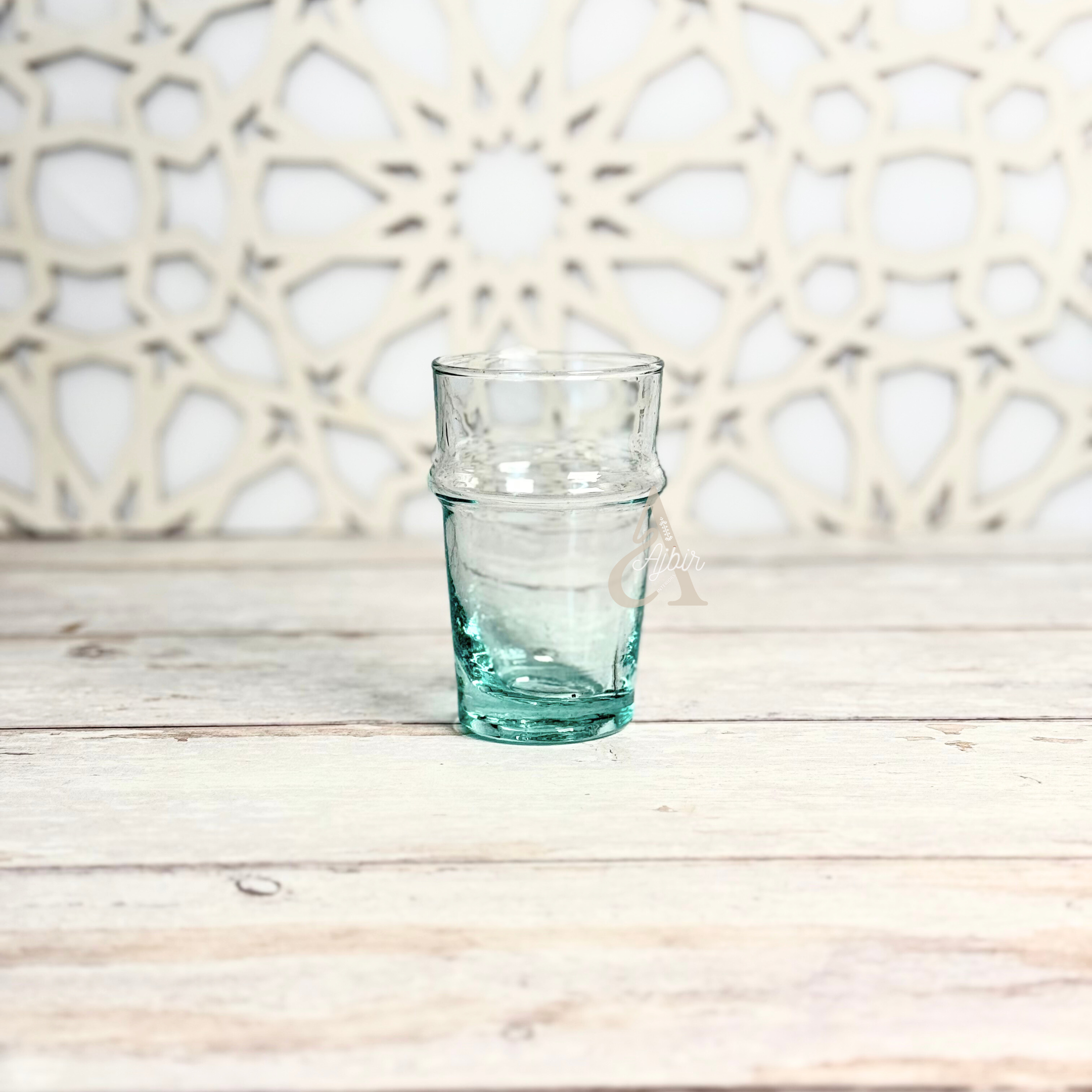 Chaque pièce est fabriquée à la main à partir de verre, offrant une transparence pure ponctuée de légères bulles d’air, signature du véritable verre beldi artisanal.
